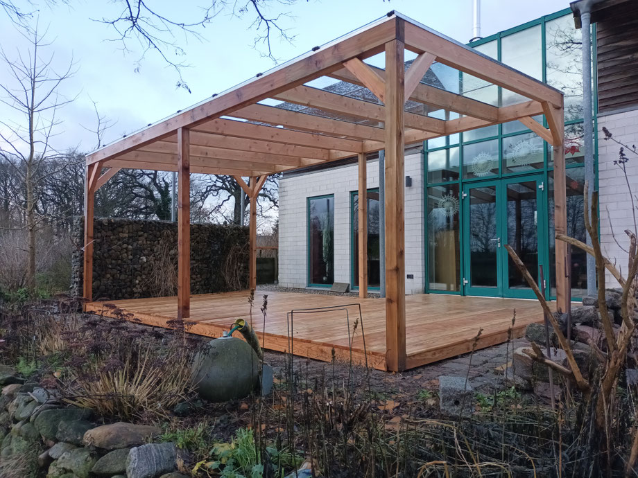 Holzterrasse aus sib. Lärche mit Glasüberdachung
